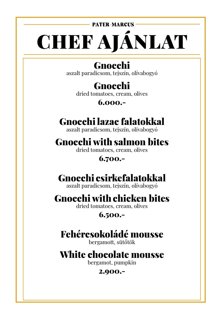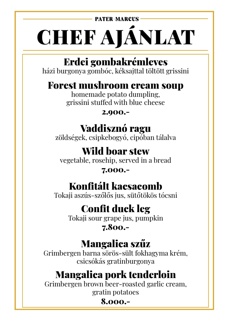 - Marha pörkölt házi tészta, krémes túró, füstölt paprika olaj7.600.- Ft